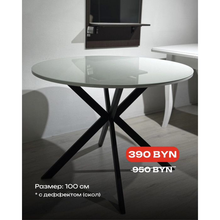 Стол ВЕГА D100 Белый, стекло/ черный каркас ДЕФЕКТ (скол) Диаметр : 100 см