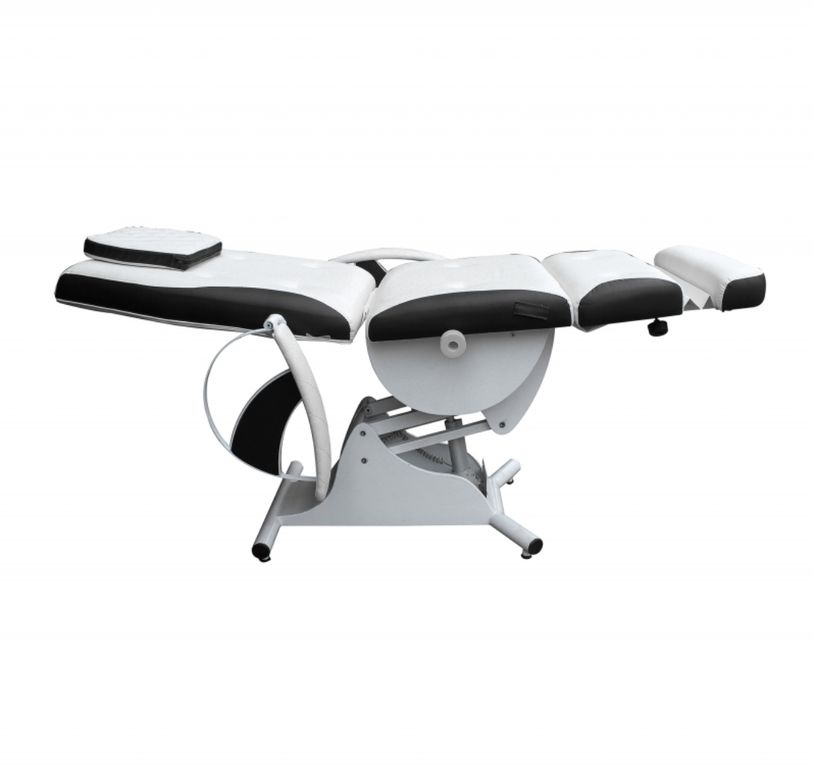 Каркас выполнен из прочной стали и покрыт краской для защиты от коррозии. Система регулировки позволяет настроить высоту кресла в пределах 27 сантиметров, а спинку и подножку расположить от вертикального до полностью горизонтального положения. Подлокотники могут откидываться, позволяя выбирать место доступа для проведения процедуры.